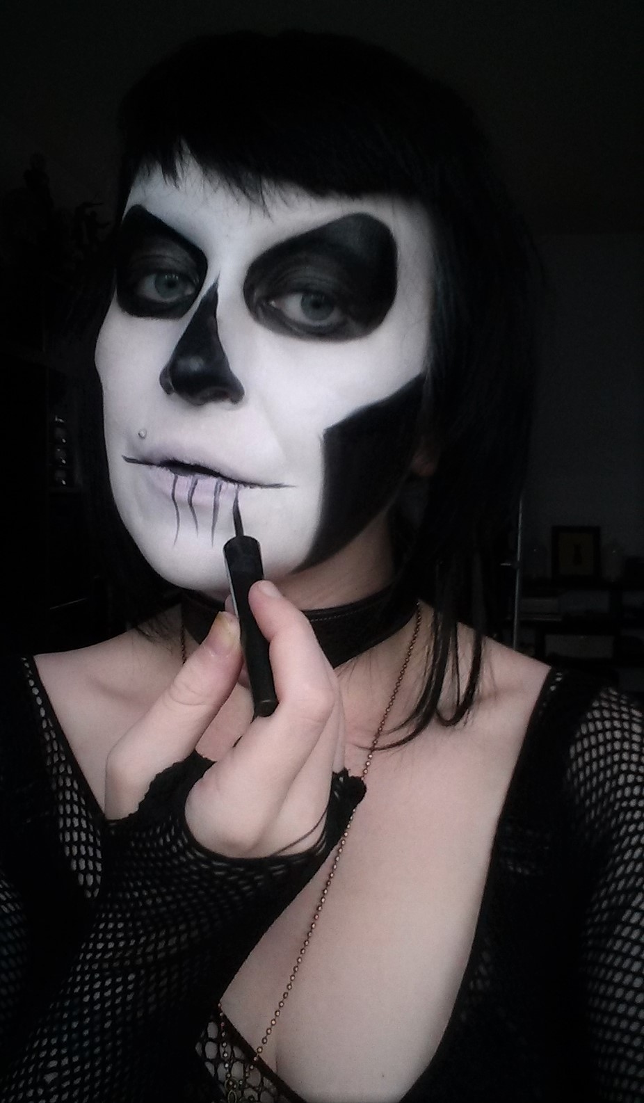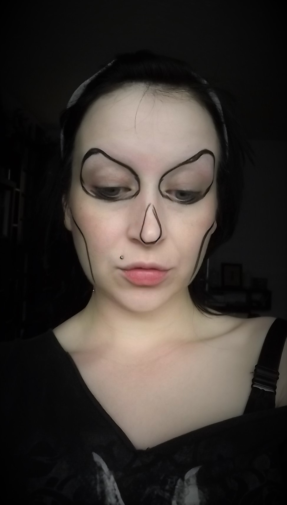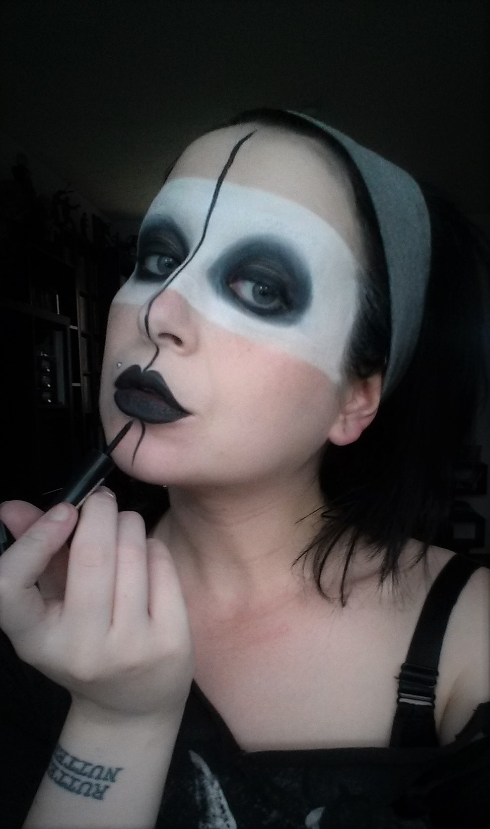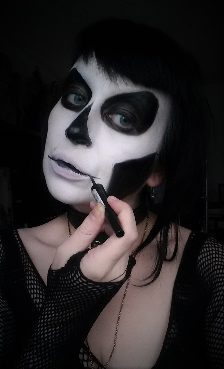 - The lips I just used a simple sharpened eyeliner pencil. Not all eyeliners are good for this but ones advertised as ‘smokey’ are! Otherwise use a pencil to outline your lips and fill in with black lipstick or face paint!
