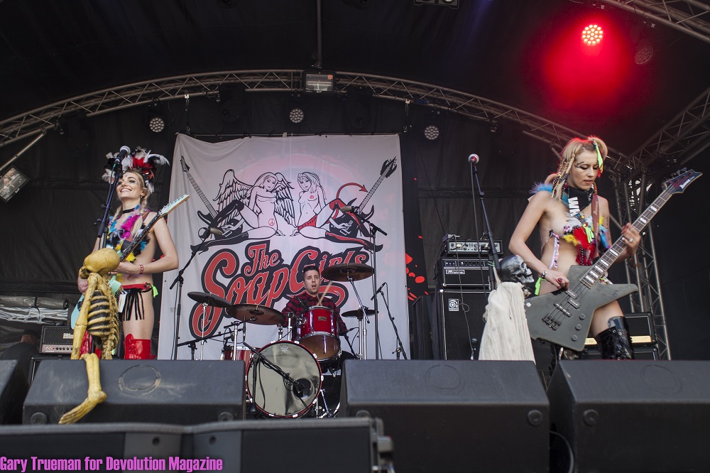 Let’s put aside the skimpy stage gear that so many seem to want to talk about and focus on the music. The Soap Girls play pop tinged grunk rock that is edgy and infectious at the same time. They have more devilish hooks than a Peter Pan villain and sing from the heart. The trio are on a roll at the moment, momentum gained through sheer bloody hard work and talent. Today they are outside on the newly invigorated Casbah stage which is notably packed with a diverse audience. The crowd rightly give the South Africans a rousing reception, shouting encouragement throughout the set. Staunchly feminist without getting all preachy on the subject The Soap Girls are a breath of fresh air at Rebellion, they are a band music in general should be applauding.