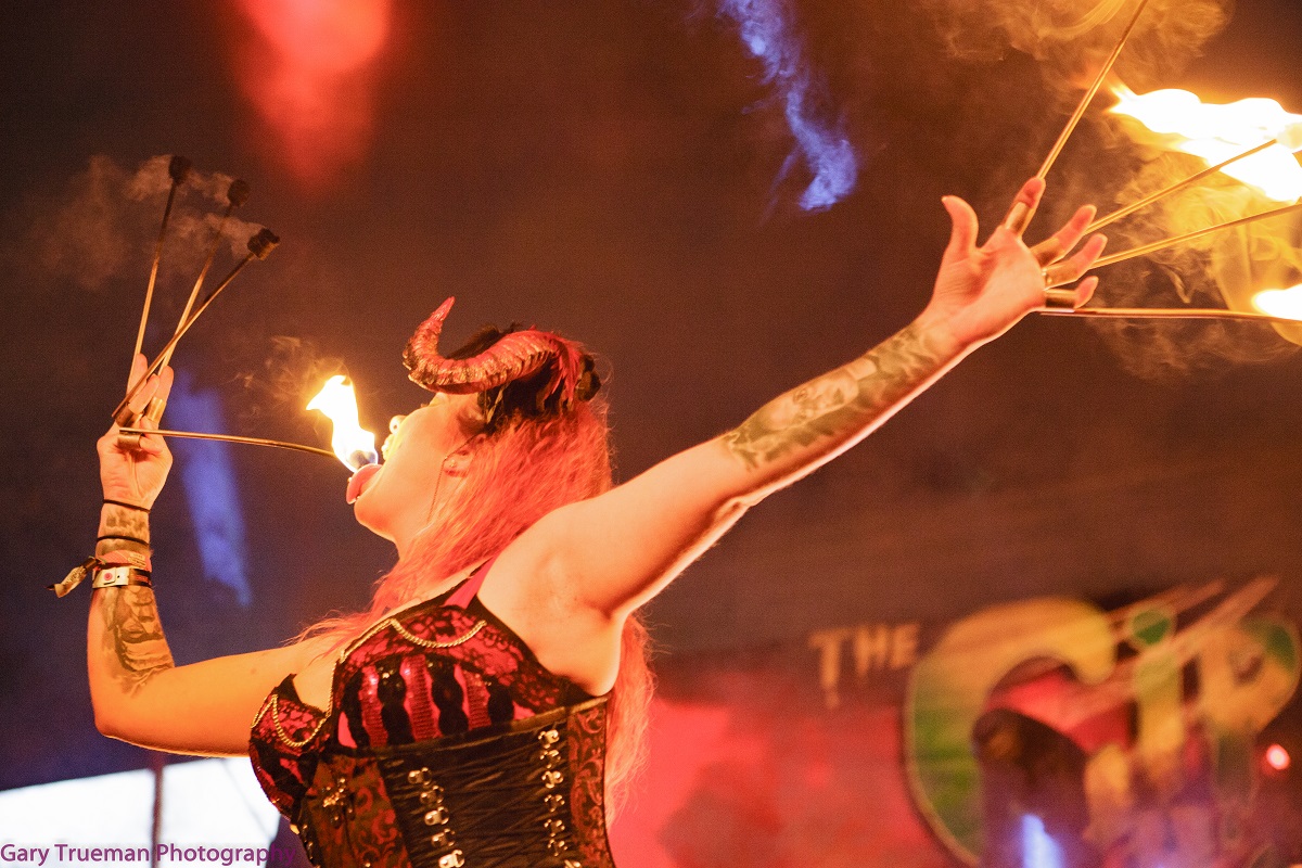 The entertainment is bolstered by a stage set up in the RIP camp site which means that some early birds get to see bands play on the Wednesday evening. Effectively opening the festival this year are London three piece The Kut who rip it up so well they end up with a stage invasion. Don’t rule them out of an arena appearance next year. Later on over at The Doghouse we’re treated to the Circus Of Horrors and Dis-Grace with Suicide Girls who both put on eye popping shows. Weather report: Warn and sultry. There’s a surreal night of comedy in the Side Splitter tent headlined by Jason Rouse.