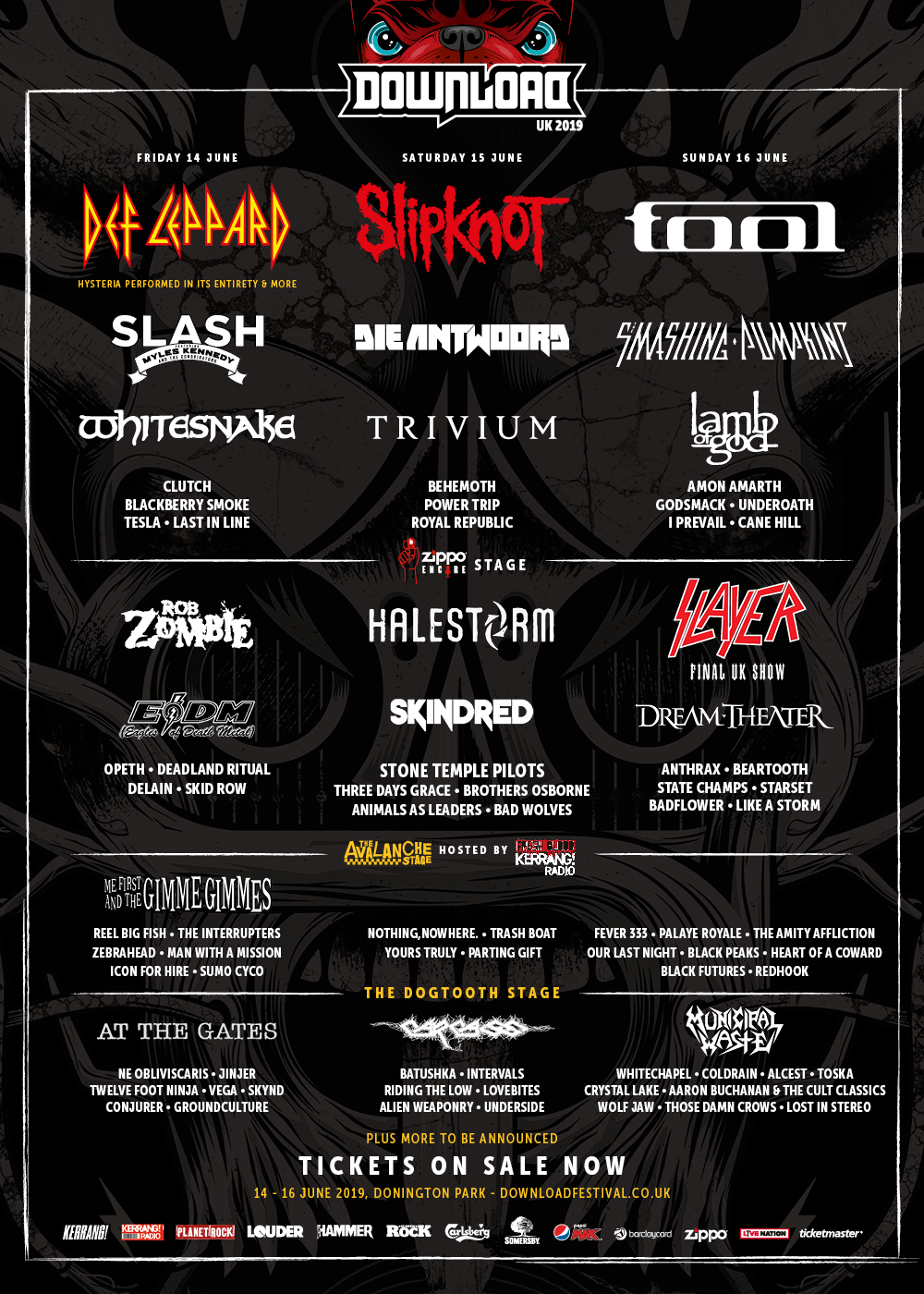 Download Festival has announced a further 43 acts including Halestorm, FEVER 333, Beartooth, Skid Row,Brothers Osbourne, Stone Temple Pilots, Clutch and many more, joining headliners Slipknot, Tool and Def Leppard for the annual rock extravaganza. The three-day festival takes place on 14-16 June 2019 at the spiritual home of rock in Donington Park, Leicestershire. Kerrang! Radio have also launched a talent search for a chance to open the Avalanche Stage at the festival, head to Kerrang! Radio for more info.