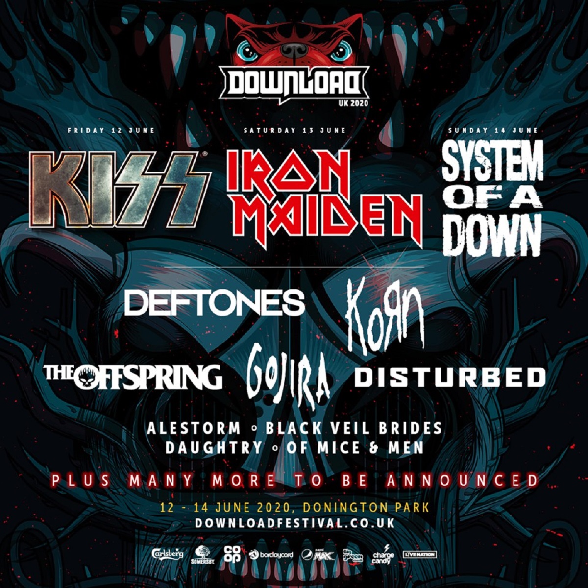 Kiss, Iron Maiden and Sysyem Of A Down have been announced as the headline acts for Download Festival 2020. Deftones, Korn, The Offspring, Disturbed, Gojira, Black Veil Brides, Daughtry, Of Mice And Men and Alestorm have also been confirmed.