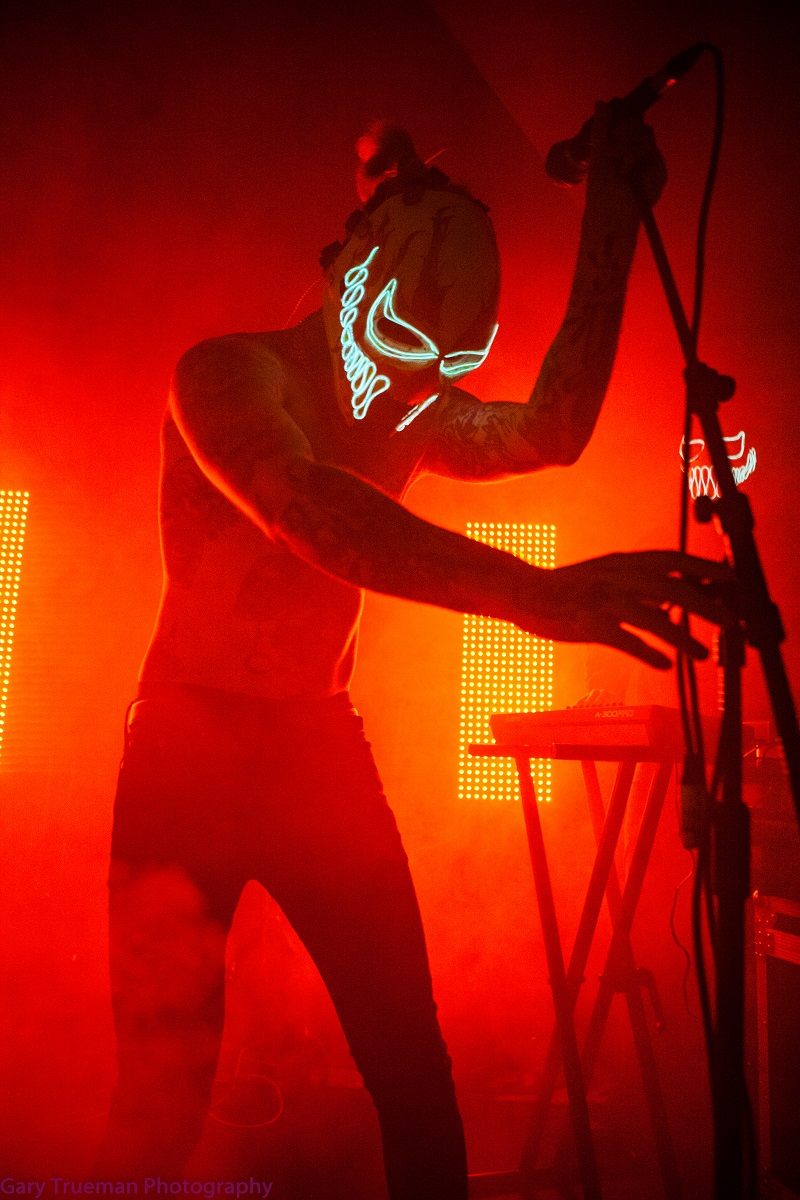 There’s a bit of stage smoke for effect, there’s goth rock full on smokescreen, and then there’s Bone Cult. The mysterious masked men now complete with an additional sticksman put out enough fog to make Jamie Lee Curtis have nightmares. With a backdrop of panel lights you’d be forgiven for thinking you’ve walked into a real life Close Encounters mother ship scenario. All this isn’t just smoke and no mirrors though, Bone Cult make great music. Coming across as a Pendulum with a hint of The Prodigy their set whizzes past in the blink of an eye. The drums are a bit of a revelation in terms of punctuating the music. This act really ought to be doing the festival circuit. I wonder what they would come up with if they played outdoors though. Time hopefully will tell.