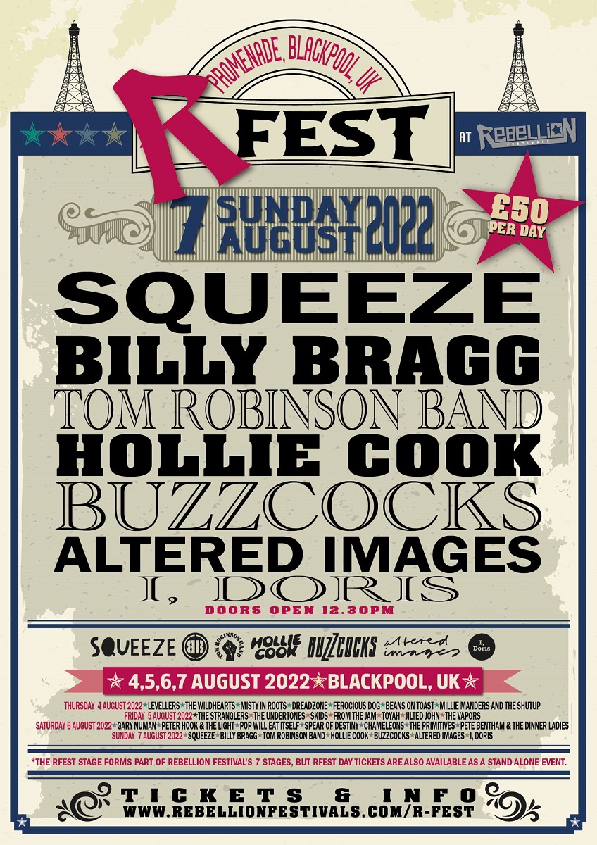 Billy Bragg has been announced for R-Fest completing the line up. He will play as special guest of Squeeze on Sunday August 7th 2022. The event is an outdoor stage and a part of Rebellion Festival although tickets can be bought for just R-Fest as a stand alone. Billed as a festival within a festival day tickets will also be available.