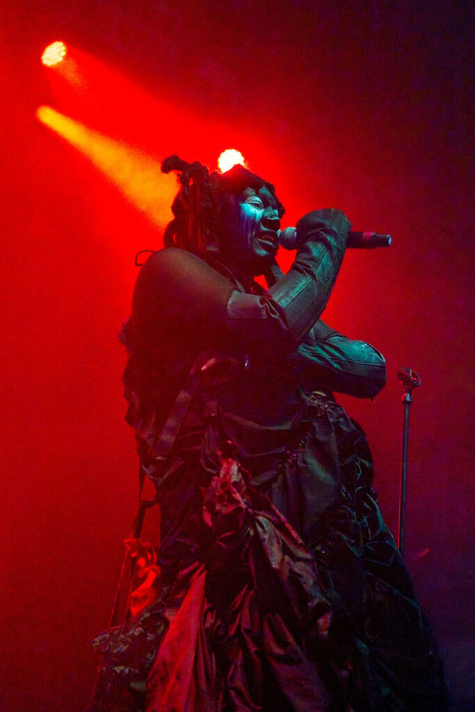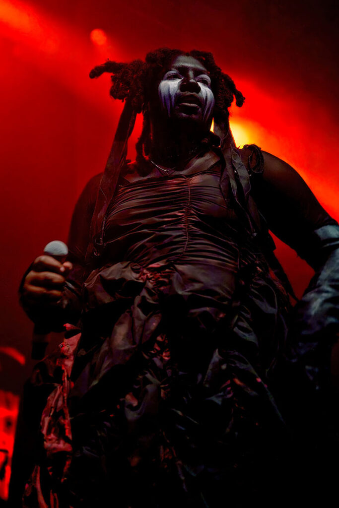 Tonight’s main event for us is the return of Backxwash to Supersonic. This year’s incredible Only Dust Remains opus was not only a switch in style away from her metal leanings, but it was also a testament to how you can be truly heavy in so many other ways. Tonight, she plays that album in full, and it’s glorious to watch. She performs her set alone, with no DJ or hypeman, just her and a microphone in front of well-placed visuals, wearing her full regalia. From the first note, the entire audience is within the palm of her hand, her crushing vulnerability front and centre as she tackles tales of drug use, suicidal ideation and a rallying cry for Palestine on History Of Violence with her lyrics in bold behind her. This performance is true, it is real, and it is delivered by a woman who, for our money, is the absolute best in the game right now. After the last note, she leaves the stage and people start milling out, when she returns for a blistering mosh pit rousing encore of the aptly titled ‘Devil In A Moshpit’. The queen returned to take her crown and left every jaw on the ground in the process, untouchable!
