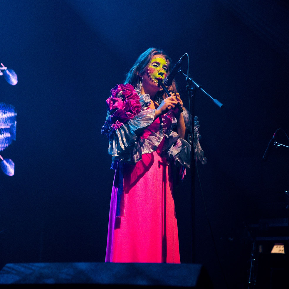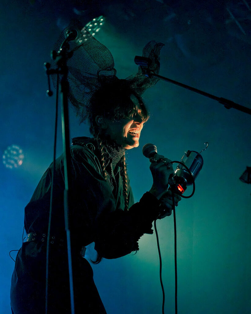 Penelope Trappes is precisely the right act for this time slot, bewitching, beautiful and ethereal are all words that spring to mind when witnessing her experimental electronica live. She employs perfect visuals and lighting to bring the audience into her lost-at-sea laments and actual stormy crescendos. Accompanied by a lone cellist who beautifully adds to the drama unfolding before us. Penelope Trappes is an astonishing performer, and her set is both musical theatre at its finest. Heartfelt, emotive, and 100% sincere, it’s a performance that absolutely wows and makes us realise we are far from convention – and that’s a very exciting prospect!