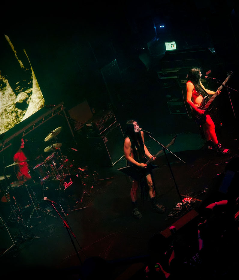 The next set is a much anticipated UK first, the Witch Club Satan live experience up until now have been a thing of whispers in the UK with images of their european festival dates and YouTube videos only giving half of the picture of what can only be described as visceral, brutal musical theatre that charts the history of patriarchy via the medium of primitive first wave black metal and tales of witch trials. Over the course of three acts, the band follows a narrative that is visceral, heartbreaking, and intense in equal measure. The much-talked-about nudity is entirely relevant as part of the narrative, as it would be in a theatre. The music is icy cold, blasting black metal, and the three females on stage are the very embodiment of rage and empowerment. It’s an unforgettable experience and one I would strongly recommend to anyone, regardless of whether they are a heavy metal fan or not.